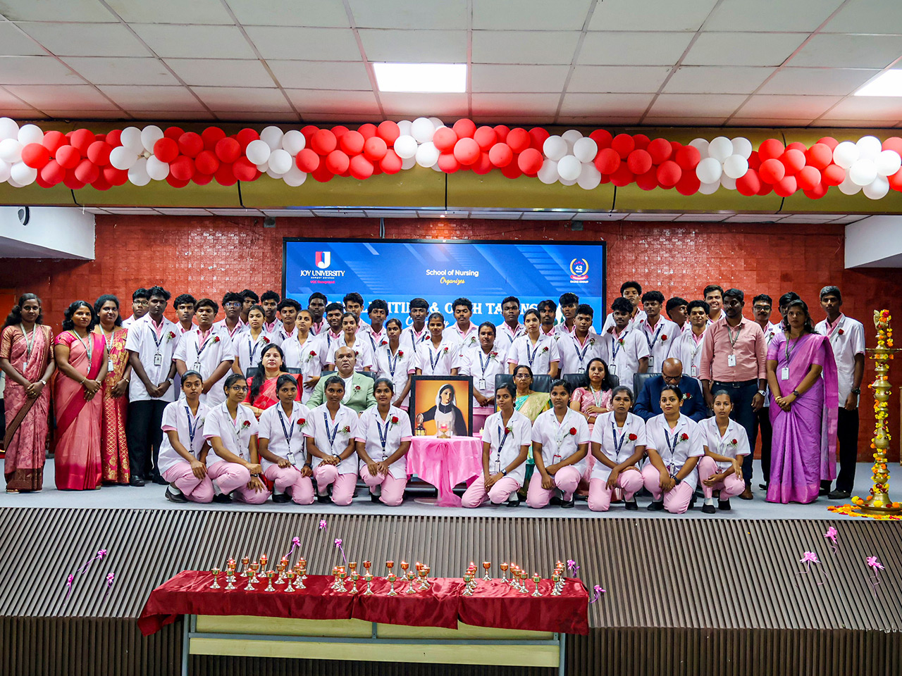 Joy University recently celebrated the Lamp Lighting and Oath Taking Ceremony for our B.Sc. Nursing III Batch at the Sardar S. A. Raja Convention Hall. This foundational ceremony represents our students' deep dedication to the service of humanity. We were honored to have Mrs. Justin Mary (Nursing Superintendent, Krishnakumar Orthopaedic Hospital) as our Chief Guest, alongside Chancellor Dr. S. A. Joy Raja and Pro-Chancellor Mrs. Gino Joy Raja.