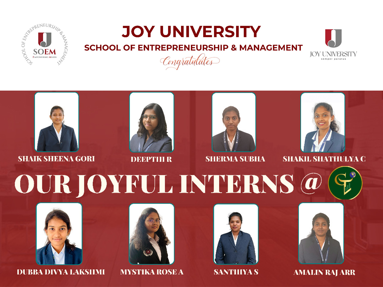 Joy University proudly congratulates our talented students of the School of Entrepreneurship and Management (SOEM) on successfully securing their internships at Tech Green Steps. This achievement highlights their strong academic foundation, professional competence, and readiness to apply classroom learning in real-world environments. The internship opportunity will provide valuable industry exposure, practical skills, and