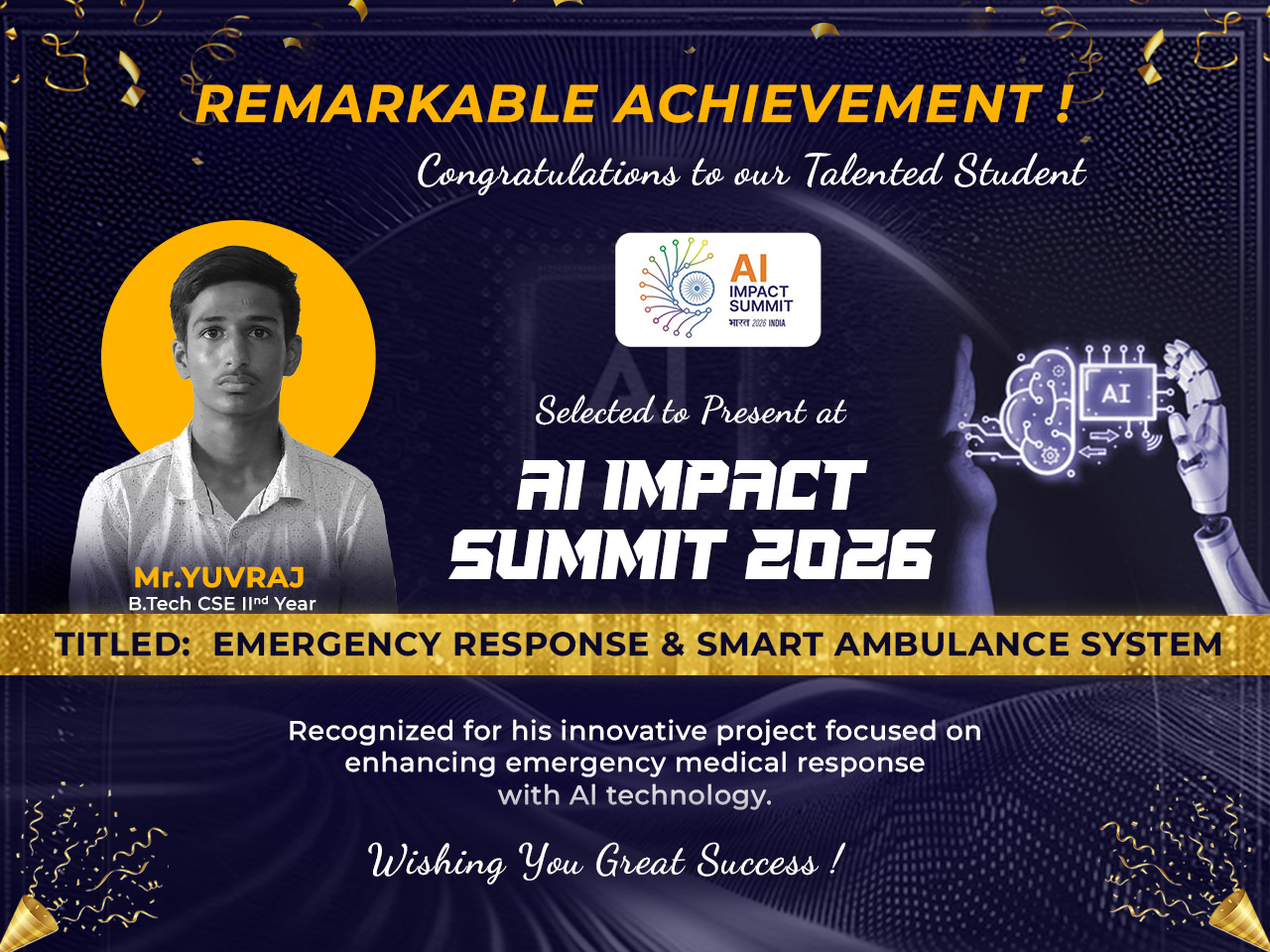 Joy University celebrates the remarkable achievement of Mr. Yuvraj, a second-year B.Tech Computer Science student, who was selected to present at the AI Impact Summit 2026. His innovative project, "Emergency Response & Smart Ambulance System," leverages artificial intelligence to enhance emergency medical response efficiency. This recognition highlights the university's commitment to fostering cutting-edge research and