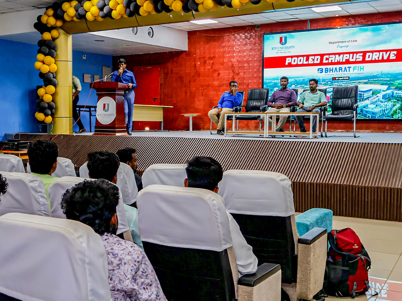 Joy University successfully hosted a pooled campus drive in collaboration with Bharath FIH Ltd (Foxconn), offering direct recruitment opportunities for engineering students. Candidates from various institutions participated enthusiastically, showcasing their technical and analytical skills through multiple selection rounds.