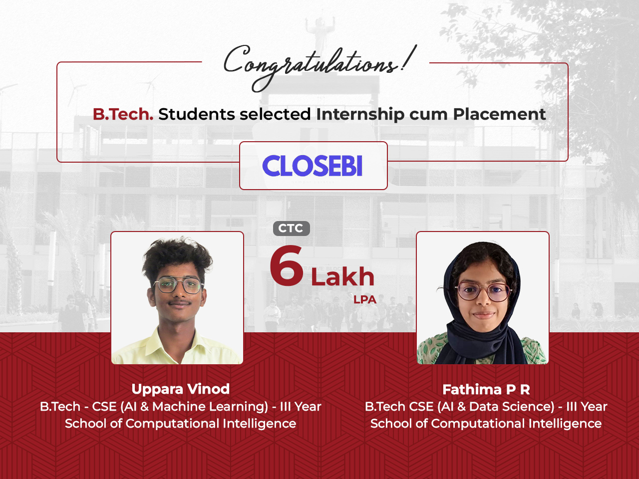 Joy University proudly announces that Uppara Vinod and Fathima P R, III-year B.Tech students from the School of Computational Intelligence, have been selected for an internship-cum-placement opportunity at CloseBI with a CTC of 6 LPA. Their achievement highlights the strong technical foundation and industry readiness fostered at Joy University.