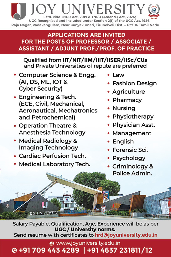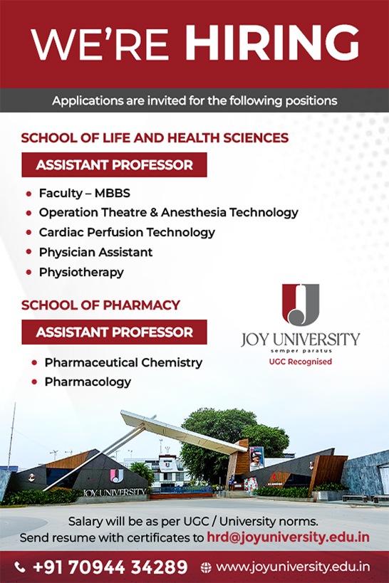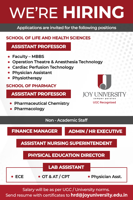 Interested candidates can send the CV along with the duly fill JU Job Application Form to hrd@joyuniversity.edu.in